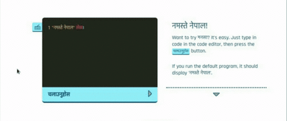 We have made a few changes to the conventional structure of a program statement to make it more expressive. For example, in function calls, the name of the function comes after the parameters, as verb comes at the end of sentence in Nepali. So "print Something" becomes "something लेख". We similarly modified other constructs such as conditionals and loops to fit into the Nepali grammar structure more. Technically, it is a very small change but it really does help make the programs more readable in Nepali. It was surprising how fluid the language becomes by changes so simple.